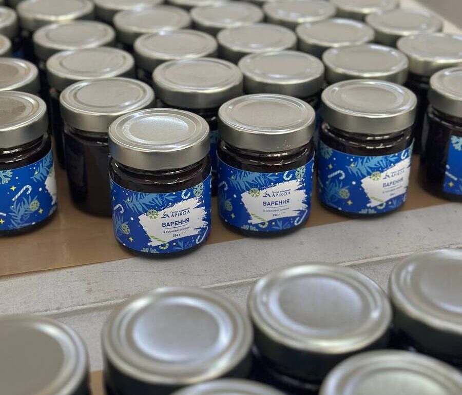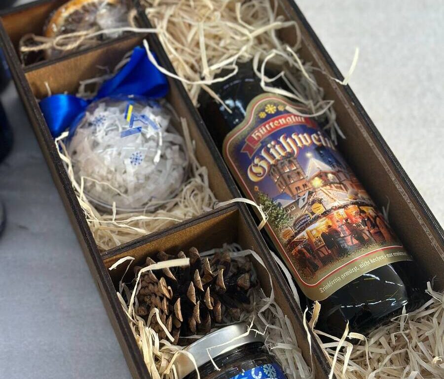 Святковий подарунок із яскравими акцентами. Набір включає прозору ялинкову кульку з наповнювачем, варення, глінтвейн і спеції для нього. Композиція поєднує декор і гастрономію, створюючи атмосферу справжнього свята.