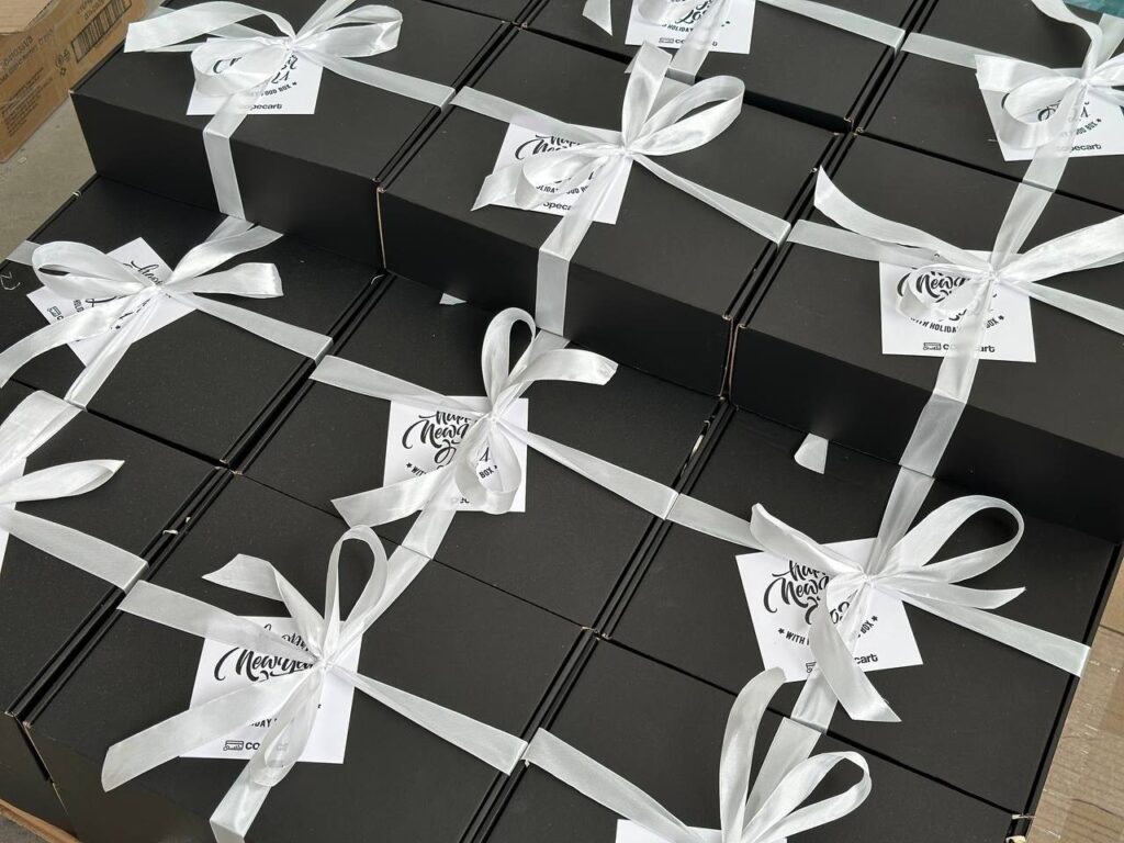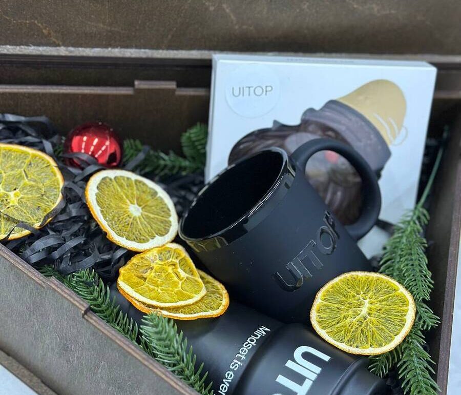 Цей набір ми оформили як теплий новорічний подарунок для команди. До нього увійшли брендовані кружки та термо-чашки, шоколад Santa, натуральний мед, текстильний гном і декоративні гілочки ялинки. Композиція передає атмосферу турботи, затишку та зимового настрою.
